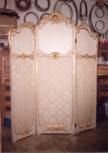The folding screen, also part of the furniture of the Duke of Milan, was completely disassembled when it arrived to our workshop. We had to redo the mortise and tenon which supported its structure. The finishing was similar to the one described for the cabinet and the mirror, consisting in applying oil paint, gold leaf and a patina. However in this case, the lower panels were upholstered with damasked silk fabric like it would have been done in its period.