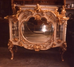 This exceptional glass cabinet was part of the furniture of the Duke of Milan, in which there was a mirror resting over it that, as described below. We first reinforced the structure of the cabinet and then restored the sculpted figures by carving the lacking parts. The glass cabinet was painted with oil, gilded with gold leaf, and a patina was applied.